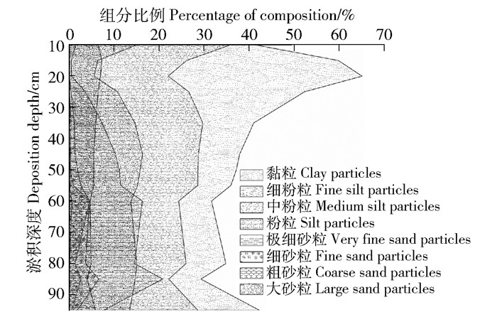 由图 2可知,随着泥沙淤积深度增加,泥沙粒径中的黏粒和中粉粒比例逐渐减少,粒径大于细粒泥沙比例值变异系数增大,可指示流域内有利于土壤侵蚀—搬运—淤积条件较好。依实地考查,在山坪塘建成初期,坡耕地耕种利用强度大,有利于暴雨事件侵蚀—搬运—沉积;后期部分坡耕地被撂荒或平整梯田,明显减弱土壤侵蚀的条件。进一步分析图 2可知,泥沙淤积在深度60和85 cm处出现转折点:在深度>60~85 cm内,泥沙粒径成分黏粒、中粉粒、细粒和大砂粒都有一定比例,表明泥沙流失淤积的水动力条件较好;在深度0~35 cm内,淤积泥沙粒径成分基本以细砂粒以下为主,表明泥沙来源的水动力条件较弱;在深度>35~60 cm内,泥沙粒径成分以黏粒和中粉粒为主,表明这泥沙来源水动力条件较差。从与农户交谈得知,流域内坡耕地经历耕种—整治—耕种—撂荒等人类活动过程,这些活动影响流域内土壤侵蚀—搬运—淤积过程的水动力条件。