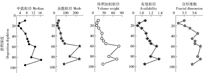 泥沙粒径分形维数D是反映土壤颗粒质地的重要参数。从图 3可知,泥沙粒径分形维数D与泥沙粒径特征参数变化趋势基本保持一致。随着泥沙淤积深度增加,粒径分形维数有逐渐增大的趋势,这说明淤积泥沙从表层向底层,泥沙粒径越不均匀,越有层次性,但深度60 cm处泥沙粒径分形维数D出现最大值3.78,其泥沙粒径均一性最差。这也进一步指示在深度60 cm处,这一时期流域内存在泥沙淤积较强的水动力条件或强降雨事件。