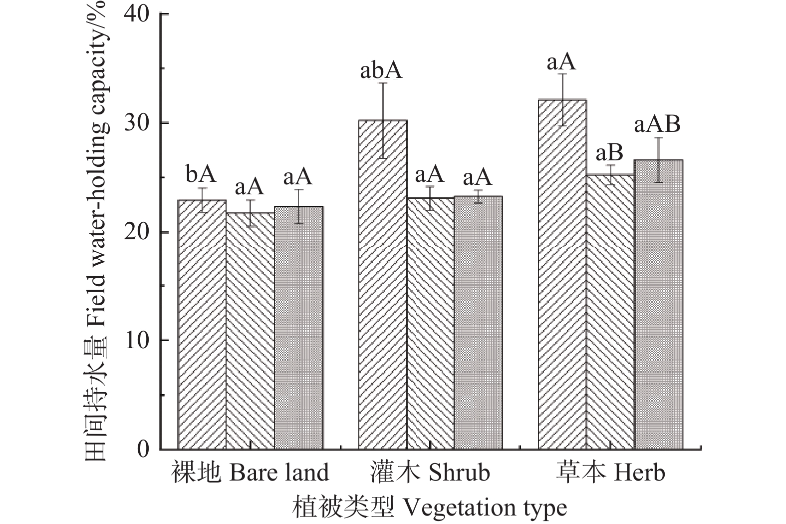 2)草本土壤团聚体MWD因受根系和降雨、露水、太阳、风等造成的干湿交替的综合影响,导致土壤团聚体破碎增加,在> 10 ~ 30 cm土层深度,MWD均小于灌木和裸地。土壤粒径的减小增加土壤对水分的吸附和滞留,增大土壤的田间持水量。