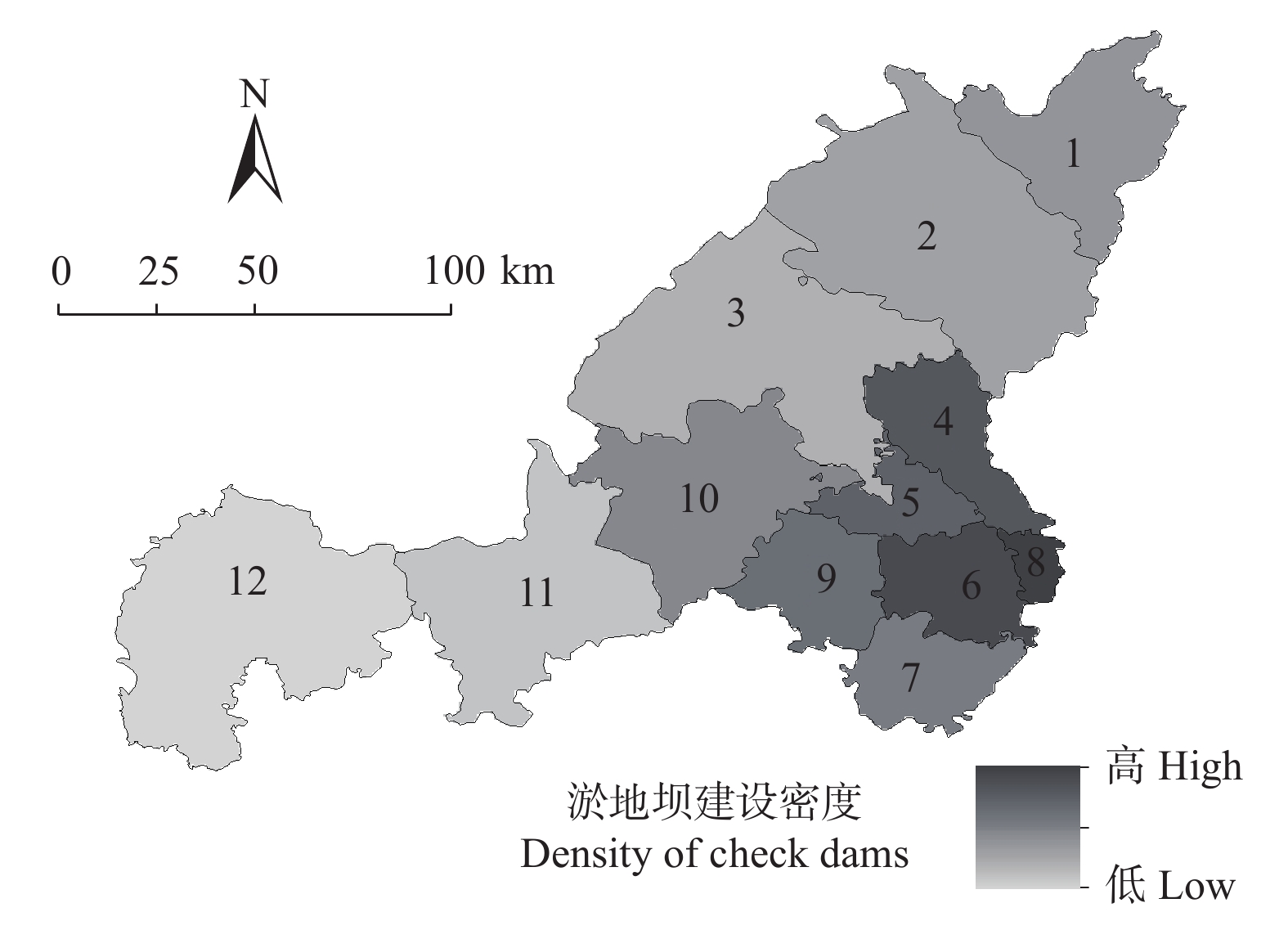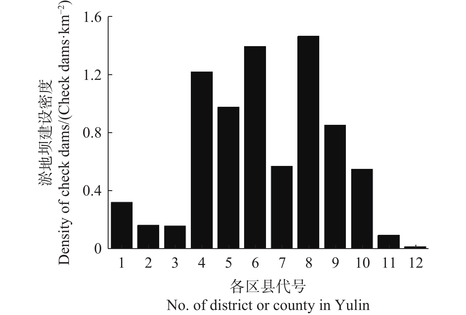 1. 府谷; 2. 神木; 3. 榆阳; 4. 佳县; 5. 米脂; 6. 绥德; 7. 清涧; 8. 吴堡; 9. 子洲; 10. 横山; 11. 靖边; 12. 定边。下同。 1. Fugu; 2. Shenmu; 3. Yuyang; 4. Jiaxian; 5. Mizhi; 6. Suide; 7. Qingjian; 8. Wubao; 9. Zizhou; 10. Hengshan; 11. Jingbian; 12. Dingbian. The same below. 图 1 榆林各区(县)淤地坝建设密度 Fig. 1 Density of check dams in each district (county) of Yulin |