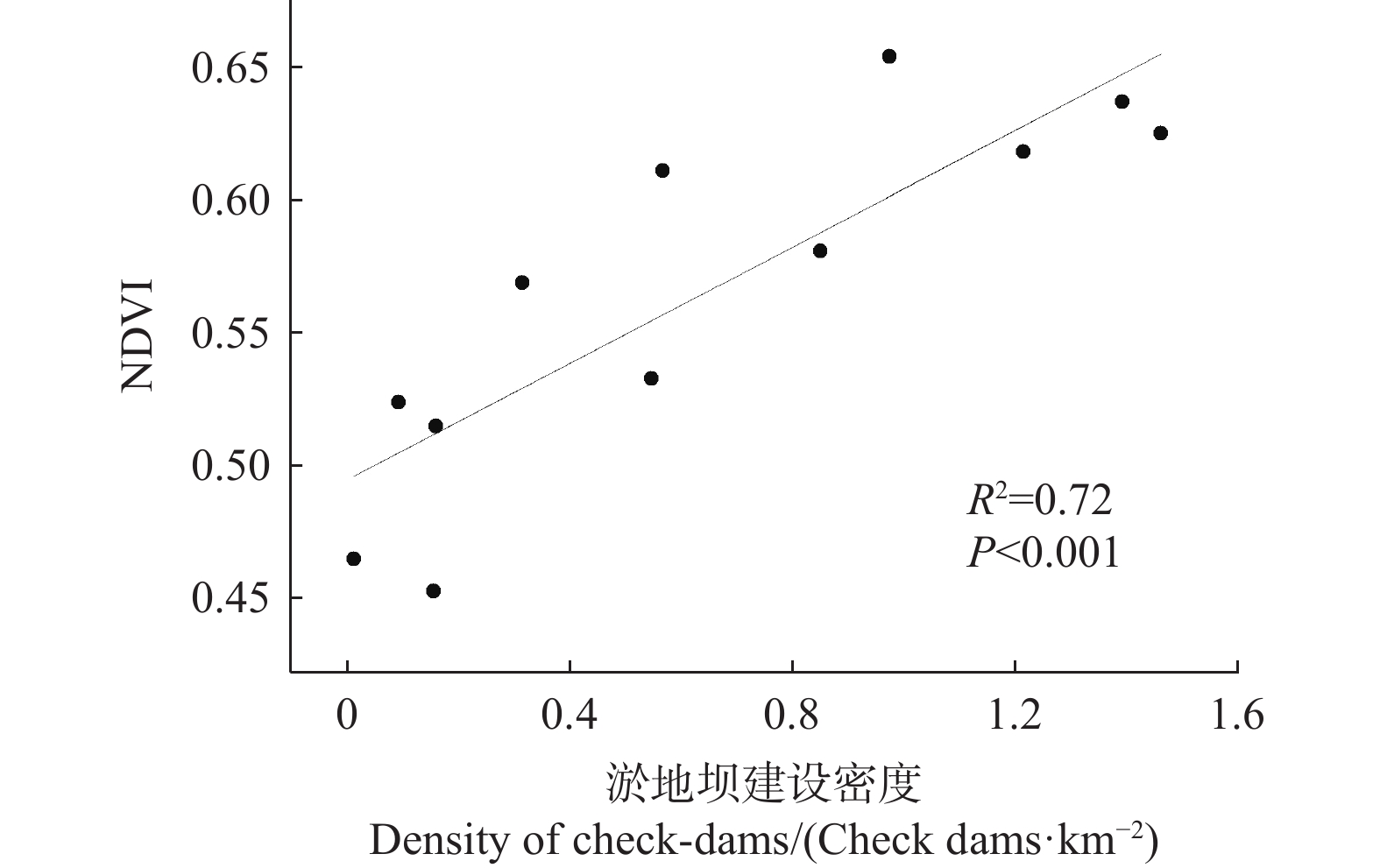 5 结论1)淤地坝建设密度大的东南部区县植被恢复更快。各区(县)淤地坝建设密度与NDVI回归斜率之间呈显著线性相关(R2 = 0.84, P < 0.001),淤地坝建设密度较高的米脂、绥德和佳县为NDVI回归直线斜率最高的区县,分别为