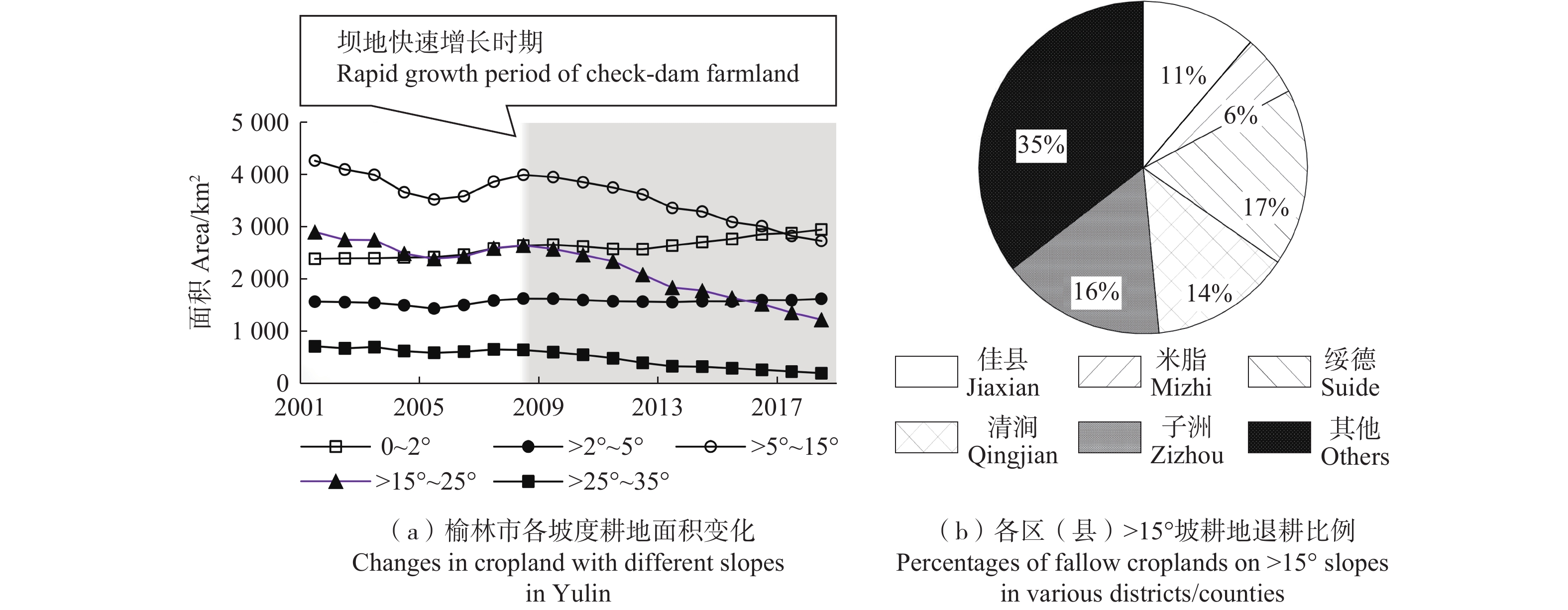 气候因素和人类活动是影响黄土高原植被变化的主要驱动因素。研究表明,在较长时间尺度中NDVI变化更易受到长期气候变化的影响,但在较短时间尺度下NDVI变化与人类活动的关系更密切[16]。在陕北黄土高原地区年降水无显著变化的情况下[17−18],整个研究时期内NDVI的持续上升表明退耕还林草工程对这一时期植被变化起到主要作用。对2001—2018年榆林市不同坡度耕地利用变化情况进行统计,可以看到(图5a)全市坡耕地面积变化主要分为2个阶段,2001—2008年间坡耕地面积先下降后上升,总体变化不大;2008年以后坡耕地面积持续下降,10年间 > 15° ~ 25°坡耕地面积由