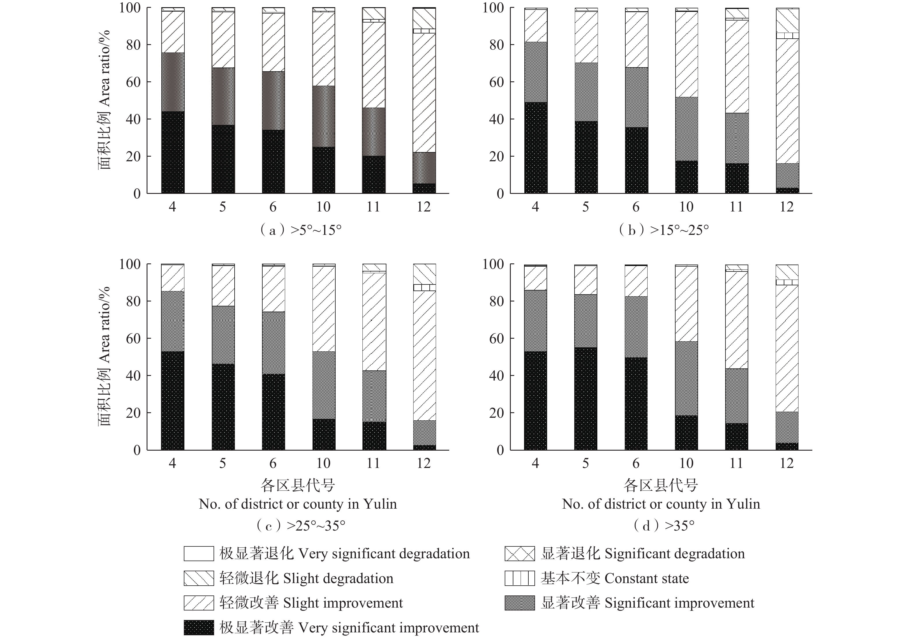 随着坡度增大,米脂、绥德和佳县的NDVI极显著改善面积比例增长较为明显。在 > 5° ~ 15°区间,米脂、绥德和佳县的NDVI极显著改善面积比例分别为37%、34%和44%,相比0 ~ 2°区间分别高出16%、15%和16%;在 > 25° ~ 35°区间,米脂、绥德和佳县的NDVI极显著改善面积比例分别为46%、41%和53%,相比 > 5° ~ 15°区间分别高出10%、7%和9%。同时东南部各区(县) > 15°坡地NDVI几乎没有出现退化,而西部区县出现一定程度的退化情况,定边县和靖边县 > 15°坡地NDVI分别有13%和5%比例的轻微退化。这表明大量坡耕地退耕还林草,土地利用结构发生显著改变是这一时期东南部区县植被快速变化的主要原因,这与Zheng等[19]对黄土高原地区植被变化因素的分析结果较为一致。