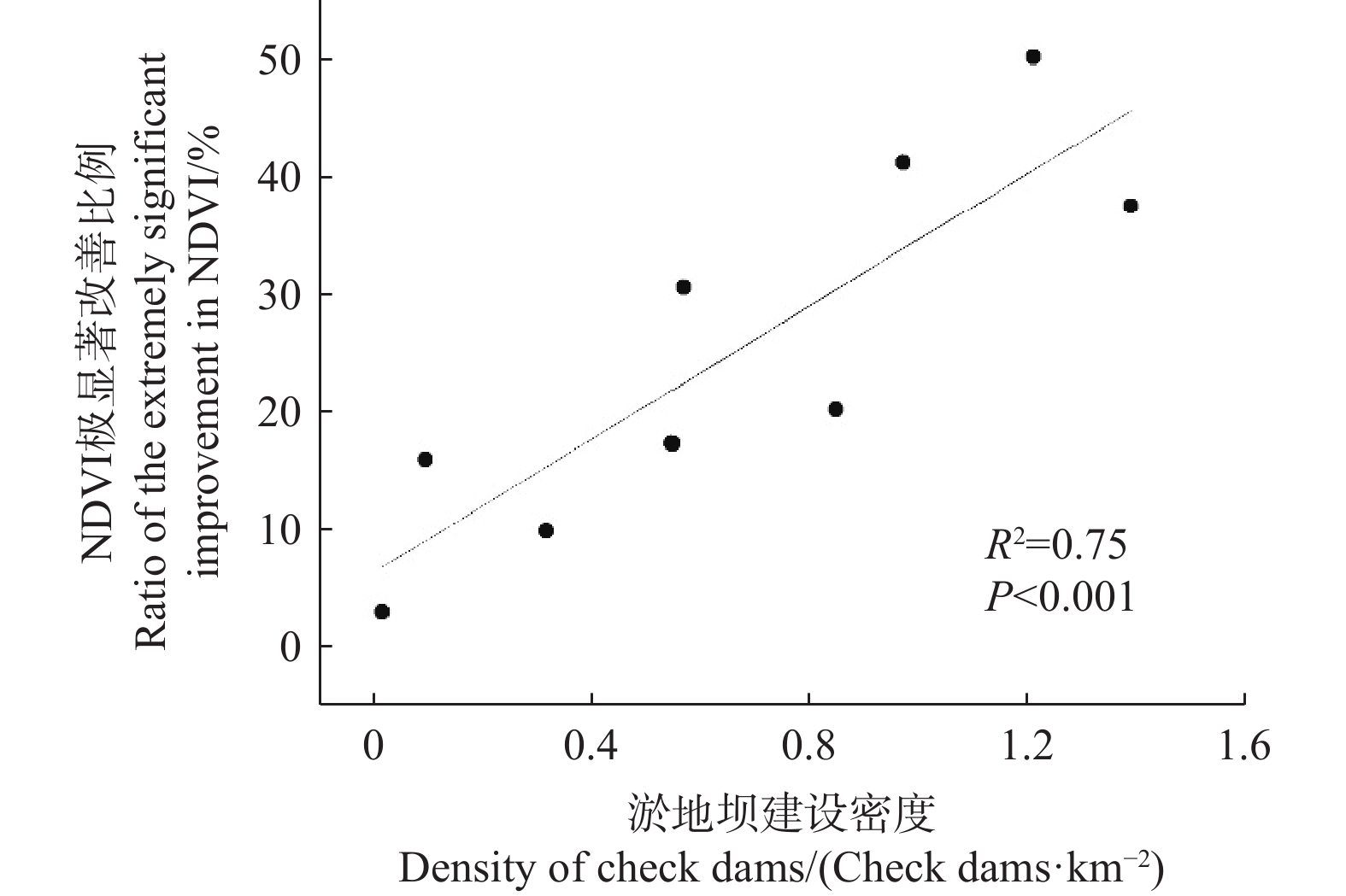 图 7 淤地坝建设密度与 > 15°坡地NDVI极显著改善比例的相关性 Fig. 7 Correlation between the density of check dams and ratio of the most significant improvement in NDVI on the slopes > 15° |