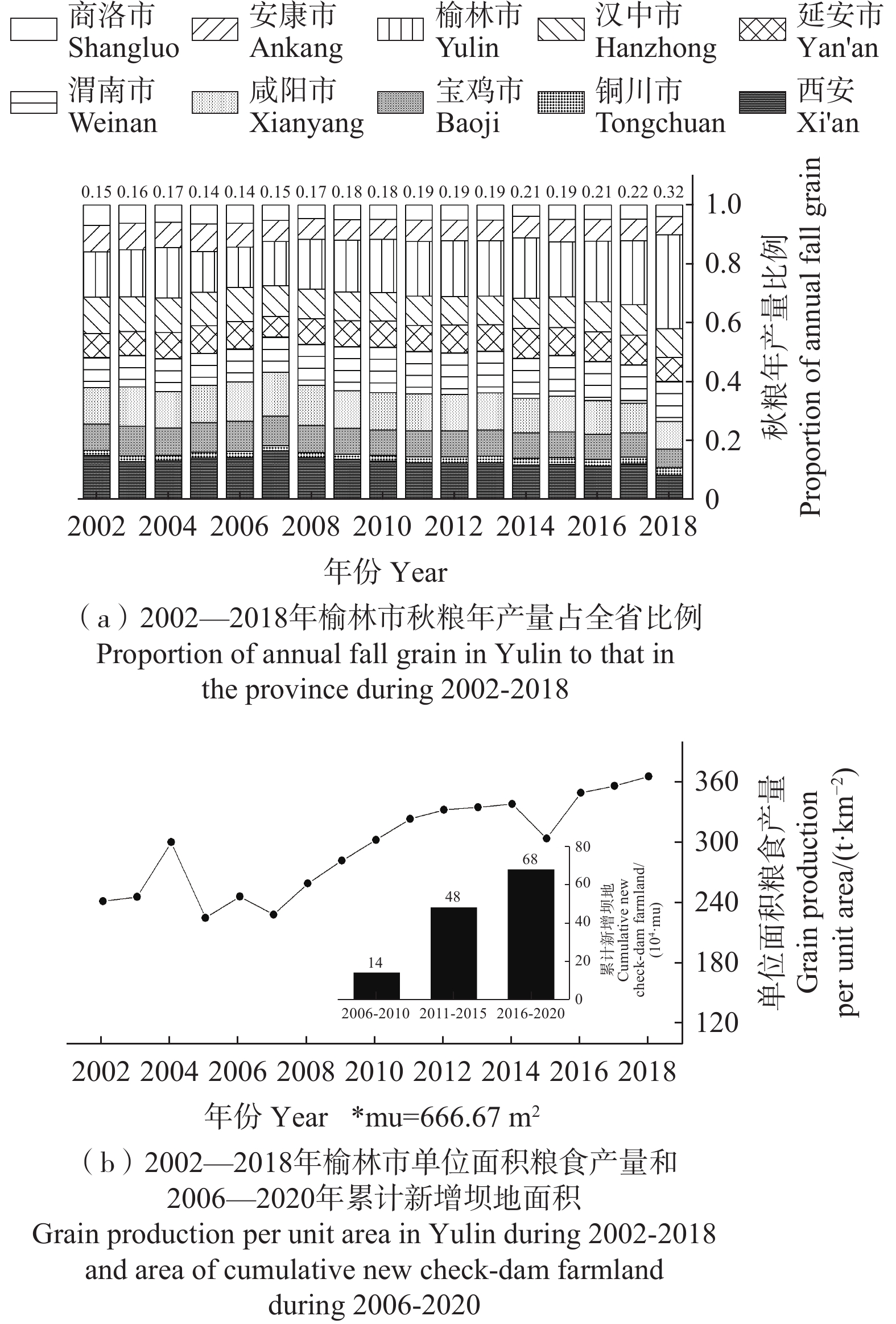 图 8 榆林市粮食产量和坝地面积变化 Fig. 8 Changes in grain production and check-dam farmland area in Yulin |