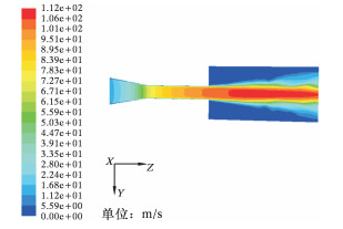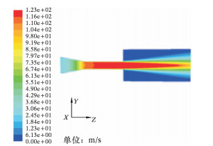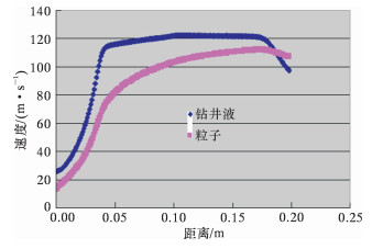 通过数值模拟喷嘴淹没自由射流情况,得出粒子加速状态和粒子与钻井液速度分布,结果如图 2、图 3和图 4所示。