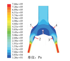 图 5显示,整个钻头内腔室中共有5个低压区,位置对称,2号、3号低压区在喷嘴座入口处靠近钻头中心处的一边。4号、5号低压区在内腔室上方外侧,1号低压区面积最大,在内腔室的正底部。