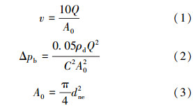 式中,Δpb为钻头压降,MPa;v为钻井液喷射速度,m/s;ρd为钻井液密度,g/cm3;C为喷嘴流量系数,取0.95;Q为排量,L/s;A0喷嘴出口截面积,cm2;dne喷嘴当量直径,cm。