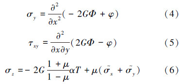 计算模型是平面应变问题,如果采用位移法求解,则位移分量、应变分量和应力分量都可用热弹性位移势来表,其温度应力的表达式为: