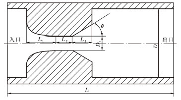 1 几何模型建立及边界条件 1.1 几何模型建立单级喷嘴结构分质注入工具为“双曲线+梯形口”形式[2],几何形状如图 1所示。图中L为喷嘴长度,L1为双曲线入口长度,L2为双曲线与梯形口过渡段长度,L3为梯形出口长度,θ为梯形口角度,D1为喷嘴缩径段直径,D为出/入口直径。