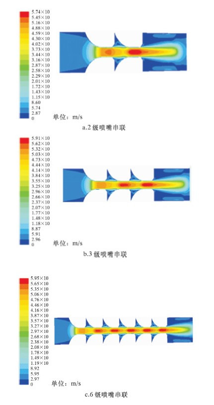 | 图 3 30 m3/d流量下各级喷嘴串联结构速度分布云图 Fig.3 Velocity distribution of tandem nozzles with differentstages under the flow rate of 30 m3/d |