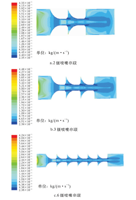 不同串联级数喷嘴的速度分布如图 3所示。由图可以看出,随着串联级数的增加,速度的最大值逐渐增大。对于串联的多级喷嘴,第1级喷嘴内的速度值要小于后几级喷嘴的速度值。从第2级喷嘴开始,喷嘴的速度分布基本一致。 不同串联级数喷嘴的视黏度分布云图如图 4所示。