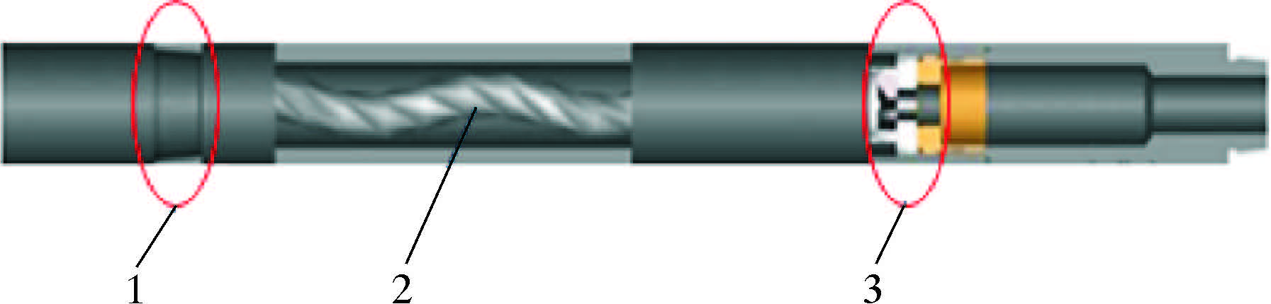 | 图 1 水力振荡器结构示意图 Fig. 1 Structural schematic of hydraulic oscillator 1-振荡短节;2-动力短节;3-阀门系统。 |