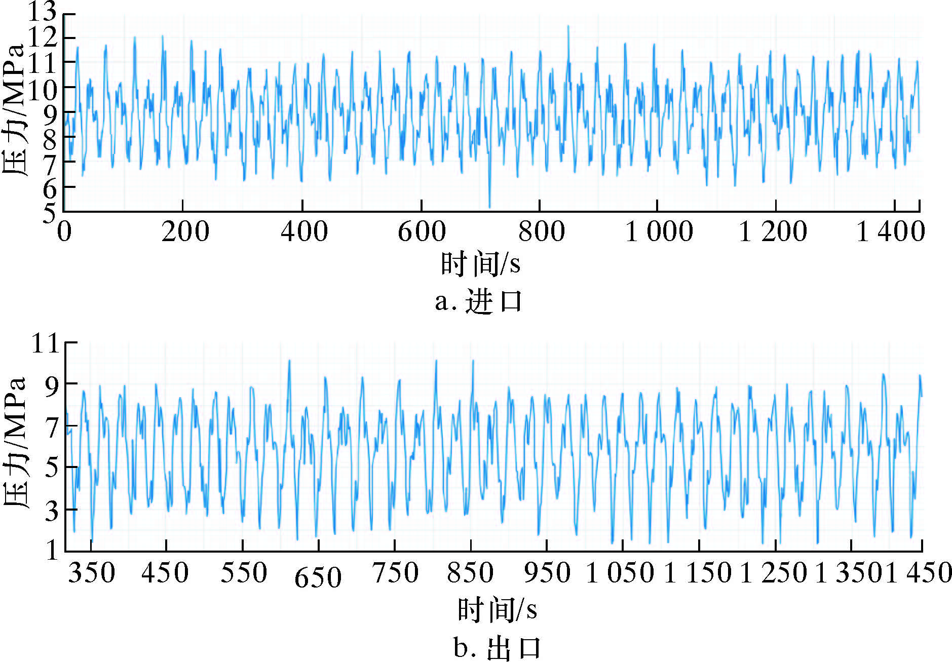 | 图 3 进、出口压力随时间变化规律 Fig. 3 The inlet and outlet pressure versus time |