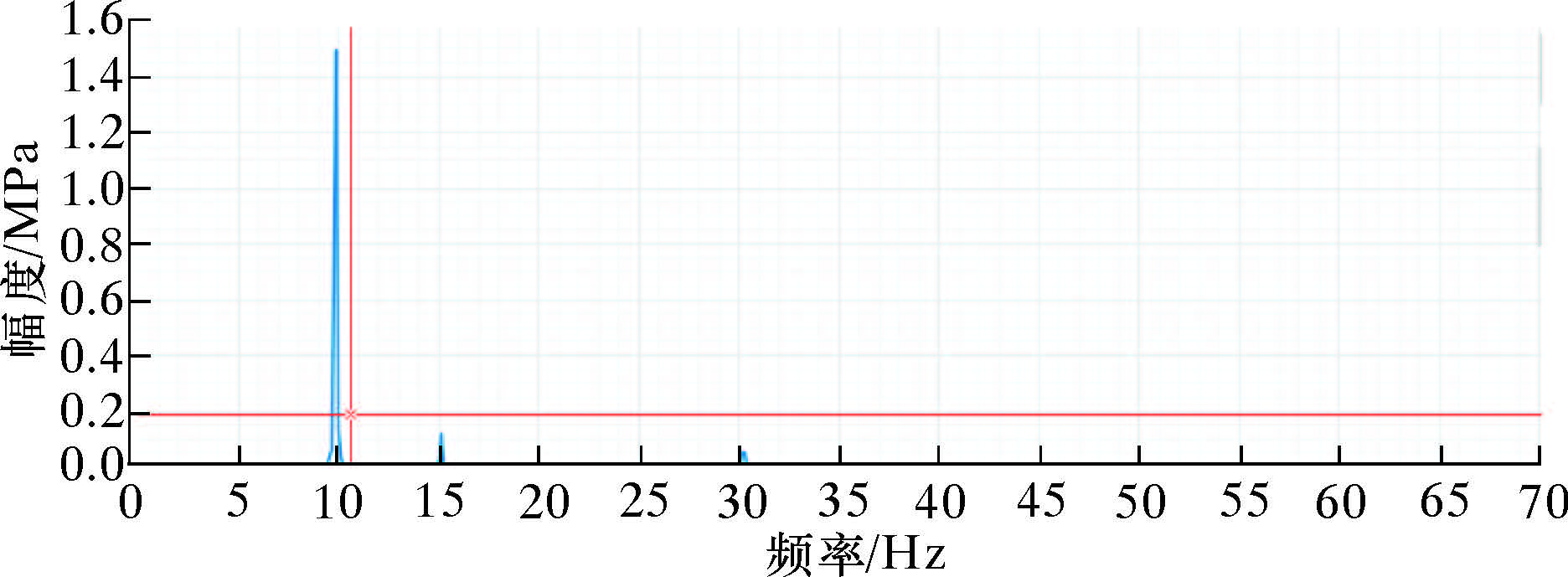in)水力振荡器,在不同定阀尺寸及流量下,对压降和振动频率进行测试分析,以期为水力振荡器的结构优化及现场应用提供理论依据。以清水为流体介质,通过钻井泵泵入清水,驱动水力振荡器动力短节的螺杆转动,螺杆下端的动阀与定阀间的过流面积周期性变化,从而产生周期性的压力脉冲,压力脉冲作用于芯轴及碟簧上,驱动工具振动。工具进、出口安装有压力传感器,用于测量其进、出口压力,测量结果如图 3所示。根据互相关功率谱(互相关功率谱排除入口和出口端其他干扰信号,保留相关的信号,如图 4所示)确定入口与出口端的相关频率,获得阀口闭合频率及工具压降。由于阀口闭合频率与工具振荡频率一致,所以可以得到工具的振荡频率。