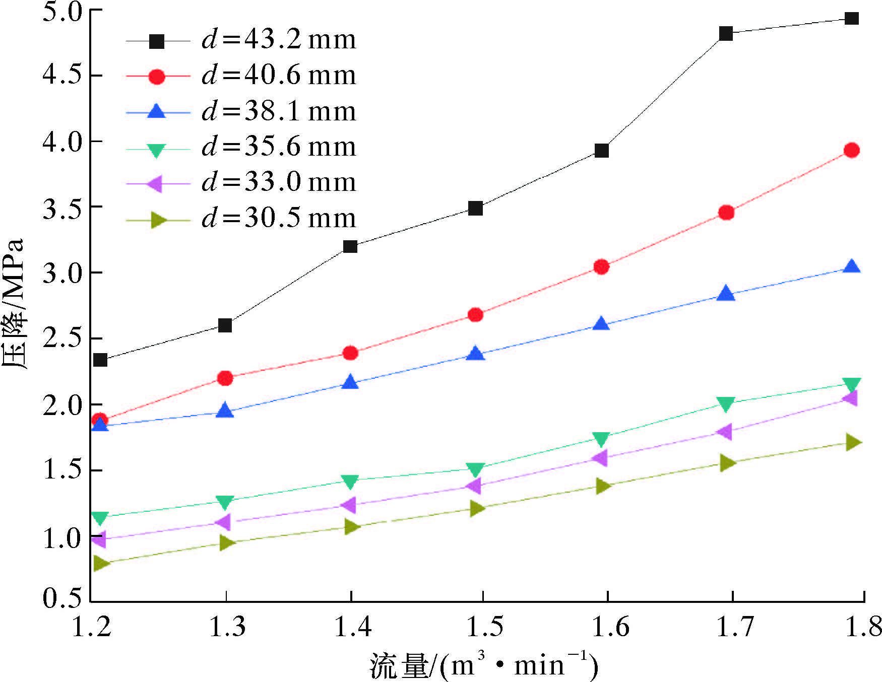 | 流量/(m3·min-1) | 压降/MPa | |||||