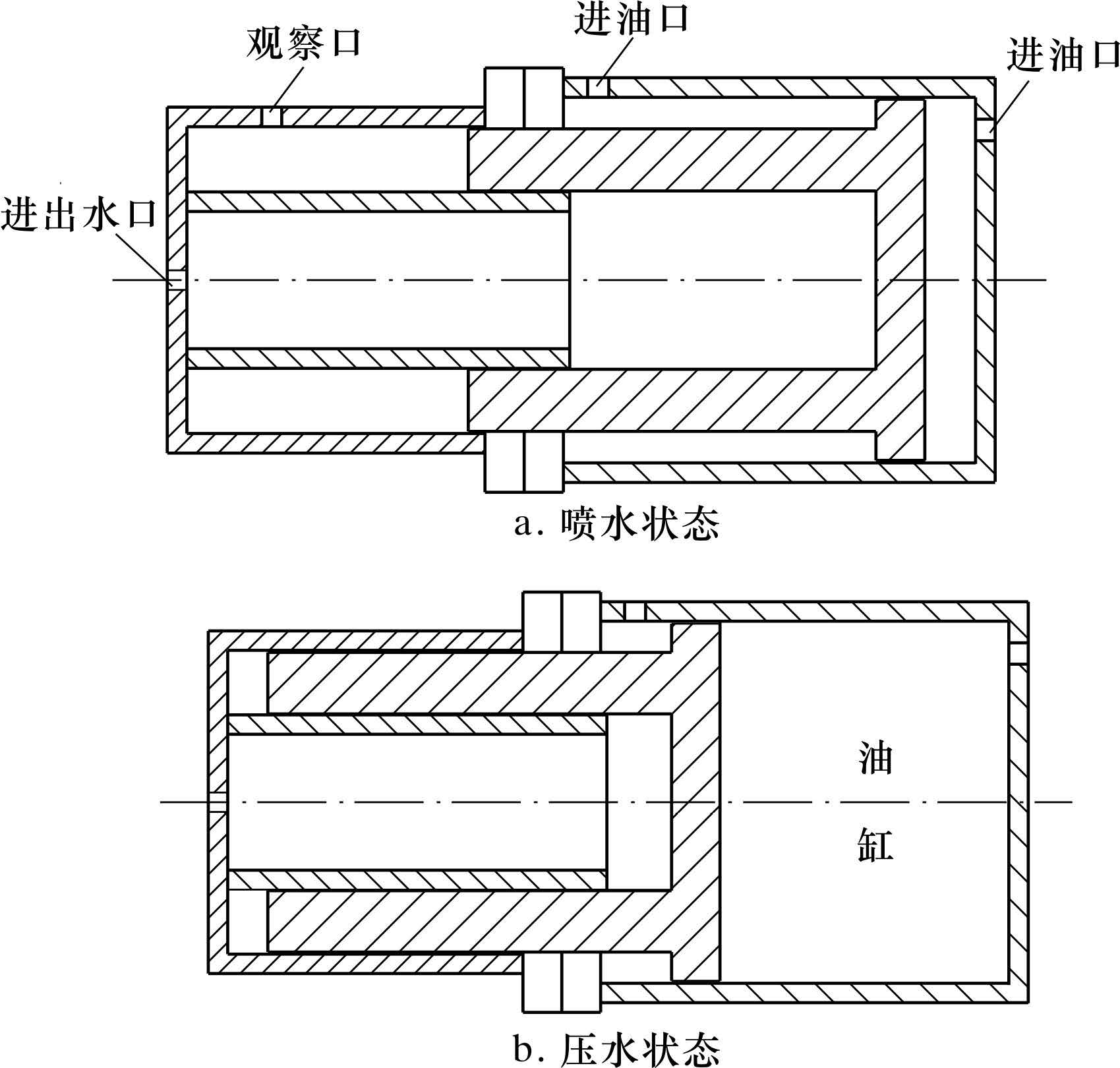 1.2.3 双向增压缸的设计上述增压缸虽可满足室内防喷器试压检测的需求,但难以满足现场应用要求。现场试压时,由于井场环境复杂,要求增压缸体积小,便于移动,且现场防喷器组及管汇容积大,需泵入的试压介质量大,普通的增压缸增压时需进行往复多个流程加压,试压时间长,升压速度慢,升压曲线连续性差。为解决上述问题,设计了双向增压缸。设计图如图 5所示。