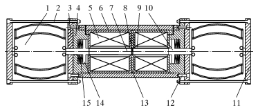 | 图 1 直线驱动器结构示意图 Fig.1 Structural schematic of linear actuator 1—声辐射器;2—连杆;3—声辐射器板;4—端盖;5—线圈;6—导磁磁轭;7—中心杆导磁段;8—中心杆非导磁段;9—线圈骨架;10—下顶杆;11—止位板;12—内六角螺钉;13—隔板;14—上顶杆;15—碟簧。 |