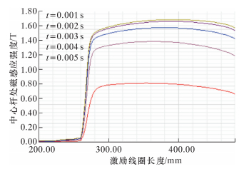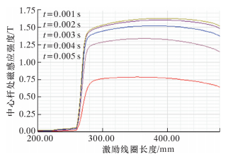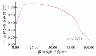 从图 5可以看出,在中心杆顶端磁感应强度迅速下降。顶端漏磁是中心杆磁感应强度不均匀的主要原因。因此在驱动器结构设计时,应尽量减小顶端漏磁,以此增加轴向磁感应强度的均匀性。