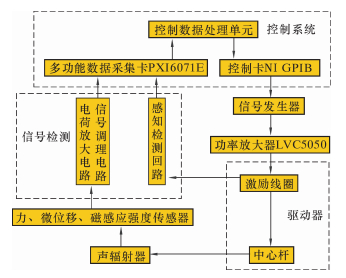 4 直线驱动器性能试验研究为检测直线驱动器的工作性能及验证上述相关理论,建立了基于LabView的直线驱动器性能检测系统。LabView数据采集系统一般由数据采集硬件、硬件驱动程序和数据采集函数几个部分组成。其测试系统组成框图如图 12所示。