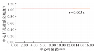 设计的直线驱动器结构要求线圈在中心杆处轴向和径向方向磁感应强度均匀。轴向磁感应强度均匀能使中心杆电磁驱动力波动小,从而电磁驱动力稳定。而径向磁感应强度均匀能使中心杆在运动过程中减小与其他结构的摩擦阻力,运动平稳。当中心杆的直径d=16 mm时,中心杆径向磁感应强度如图 4所示,径向均匀,图中t为测量时间点。