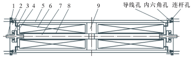 | 图 6 直线驱动器结构示意图 Fig.6 The structure of the linear actuator 1—顶杆;2—端盖;3—碟簧;4—磁轭;5—圆套筒;6—激励线圈;7—中心杆;8—线圈骨架;9—隔板。 |