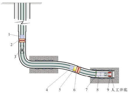| 图 3 全井管柱结构 Fig.3 The whole string structure 1、4-伸缩管;2、6-Y441封隔器;3-集成式同心配水器;5-安全接头;7-球座;8-打孔短节;9-底丝堵。 |