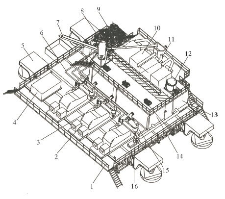 | 图 1 整体步进移运系统结构示意图 Fig.1 Structural schematic of overall stepping transport system 1—拖橇体;2—泵组;3—灌注系统;4—步进液压站;5—步进装置;6—高压管汇;7—岩屑输送器;8—泥气分离器;9—节流压井管汇;10—振动筛;11—飘台和管线;12—除气器;13—振动筛罐;14—吸入罐;15—吸入管线;16—钻井液输送系统。 |