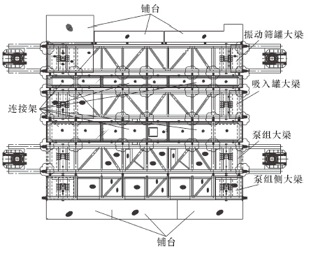 1 总体方案钻井液模块需配置3台F-1600E泵组、灌注系统、吸入罐、振动筛罐、岩屑处理器、高压管汇、节流压井管汇及泥气分离器等。钻井液模块将所有设备及设备间的管线连接布置在一个大的框架式拖橇上,拖橇外形尺寸超过20 m×20 m。钻丛式井时,整个模块通过底座四角端头的步进装置实现所有设备整体移运,步进装置可实现模块的纵向、横向平移以及沿几何中心旋转移动。远距离搬家时,由于尺寸限制,为获得良好的通过性和较快的移运速度,拆除连接点的内、外锥和连接管线,将模块分为2个单元,利用轮式移运系统实现快速搬家。到达目的地后,对接连接点使2个单元连接成为一个整体,进入钻井工作状态。