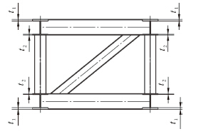 2.1.3 钻井液拖橇受运输尺寸的限制,拖橇由4套大梁组成,大梁之间用连接架过渡,大梁与连接架之间采用销轴连接,如图 2所示。为了尽可能减轻质量以及便于各管线和电缆的布置,底座大梁设计成抗弯能力较强的框架结构,大梁为上、下翼板厚度不等(t1>t2)结构,如图 3所示。为了保证结构设计的可靠性,对受力最恶劣的连接耳座、焊缝以及销轴进行受力分析,并且利用有限元分析软件对拖橇结构进行改进。