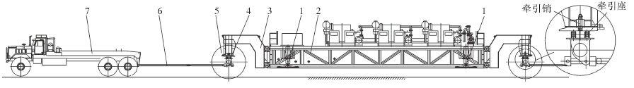 | 图 4 轮式移运结构示意图 Fig.4 Structural schematic of wheeled transportation 1—液压提升系统;2—拖橇体;3—鹅颈;4—轮轴总成;5—鹅颈牵引座;6—轮轴总成牵引架;7—牵引车。 |
