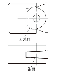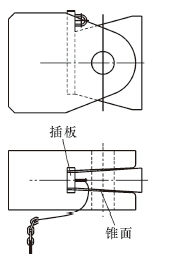 下侧内、外锥侧面为锥面并留有一定的间隙,保证插入方向能有足够自由量,将外锥上、下侧斜面设计为圆弧结构,便于相对旋转,保证了内、外锥顺利对接,如图 6所示。上侧内、外锥侧面采用锥面并留有一定间歇,保证插入方向能有足够自由量,外锥端面接触处设计为插板结构,在蚂蚁台上组装后,根据实际间隙量加工插板,插板端面受压,销轴只起连接作用,如图 7所示[11]。