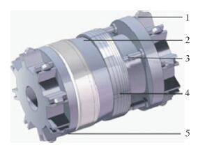 | 图 1 管内封堵器机械结构 Fig. 1 Mechanical structure of plugging tool 1—支撑轮;2—楔形承压块;3—推力杆;4—锚爪;5—密封圈。 |