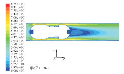 3 数值模拟结果及分析因为模型轴对称,所以取对称面(x=0的平面)来研究管内流场状态较为直观。图 4为管内流场绝对压力云图。由图可知,封堵器前、后端面压差较大,这是封堵器能在管内运动的动力来源。封堵器头部的连接槽位置出现局部高压,在封堵器和管内壁之间的狭长缝隙内的流体压力变化相对较为剧烈,对管壁存在一定冲击。整体来看,封堵器周围流场自上游至下游的压力分布呈明显区域化,且径向对称,有利于封堵器在管内平稳输送。低压区主要集中在封堵器尾部附近流场,主要由于该位置流域面积变化大,流动状态复杂,伴随产生回流和漩涡,导致大量能量损失。