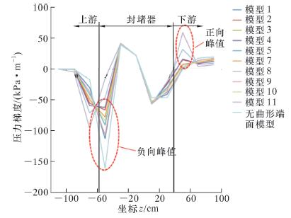 由图 6可直观看出,所有模型的压力梯度变化趋势基本一致,其差异主要集中在上、下游靠近封堵器端面的位置,且该位置的压力梯度绝对值与其他位置相比要大许多并出现正、负向峰值,主要原因是这2处流域面积发生较显著的变化,改变了管内流体原有的流动状态,从而伴随着流速和压力的巨大变化,这是造成管内流体不稳定的主要原因,并且这种现象在无曲形端面模型的上游位置更为明显。由于封堵器的动力来源是前、后端面的压差,所以压力的剧烈变化会严重扰乱封堵器正常的运动状态,不利于其平稳运行,研究流体在这2个特殊位置的流动状态具有重要意义。此外,不同模型之间在这2个位置的压力梯度也有较明显的差异,证明不同参数的曲面结构确实会对流场造成不同程度的影响,因此通过优化端面参数来提高管内流场的稳定性具有较高的可行性。