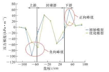 依据最优化计算得到的参数组合建立封堵器仿真模型,进行迭代计算得到的响应值明显低于所有正交试验组,且试验值与数学模型预测值的误差仅为1.1%,再次证明所建立的数学模型能准确预测试验结果,优化结果可靠性很高。将初始设计模型和优化设计模型的试验结果进行比较,结果如图 9所示。优化模型的压力梯度变化较为平缓,且在前、后端面的峰值位置后者也明显低于前者,优化效果好。