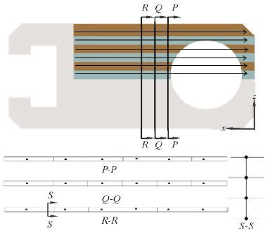 为了方便对温度场和应力场计算结果进行分析,在距熔覆起始点76、68和60 mm的P-P、Q-Q和R-R面上取点,每个面6点均位于熔覆层轴向中心位置,如图 4所示。