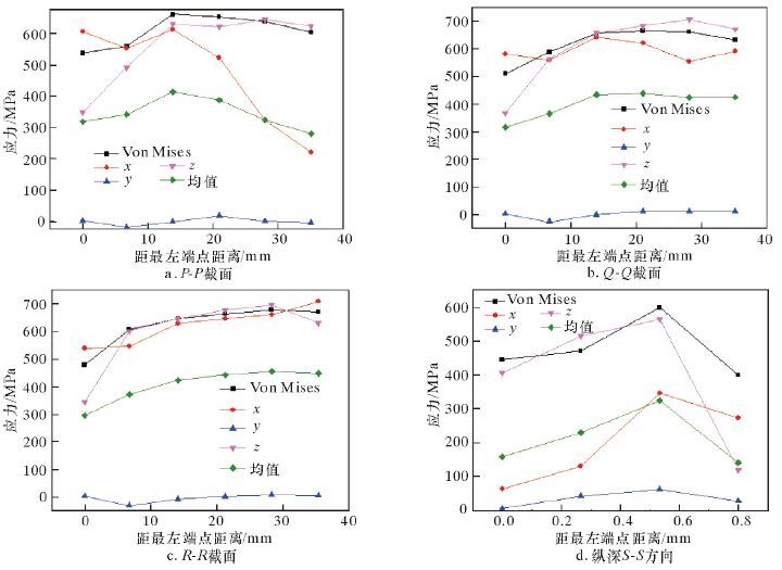 由图 7a、图 7b和图 7c可以看出,熔覆层内受拉应力较大,其中主要表现为x向和z向拉应力,最大峰值达600 MPa以上;y向拉应力最小,变化规律并不明显且保持在零点附近。主应力和Von Mises等效应力随着距最左端点距离的增加呈增大趋势,说明随着激光熔覆搭接道数的增加,熔覆层残余应力逐渐增大。对各向应力曲线进行对比,可以看出P-P截面各点Von Mises应力最大,R-R截面各点Von Mises应力最小。这说明越靠近闸板中心圆孔,熔覆层拉应力越大,这和熔覆试验中裂纹易在圆孔附近出现相符。图 7d为R-R截面上S-S处各点的各向应力曲线,表示的是熔覆层厚度方向上的应力分布变化。由图可以看出,熔覆层表面应力最小,随距表层距离的增加,各向应力值逐渐增加,在距表层0.53mm处达到最大值,Von Mises等效应力峰值为598 MPa,主应力峰值为324 MPa,表明熔覆层中应力最大值在熔覆层内。