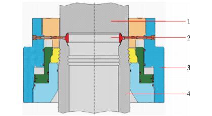 | 图 1 连接部位典型金属密封示意图 Fig.1 Schematic diagram of the typical metal-metalseal of the connection 1-上部组件;2-金属密封圈;3-连接器;4-下部组件。 |