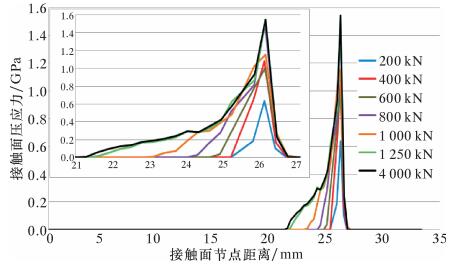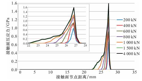 选取VGX密封钢圈,对2型面分别施加200~4 000 kN不等的预紧力,分析并对比主密封面在不同预紧力下的初始密封能力,结果如图 9~图 11所示。