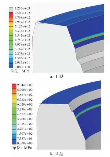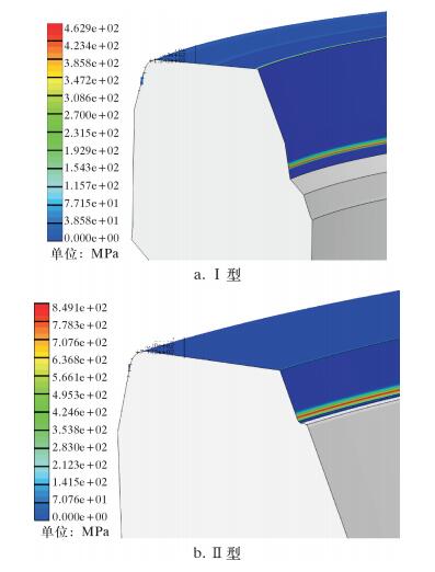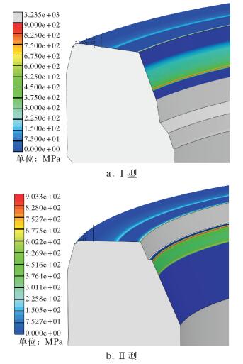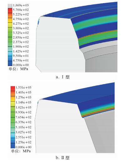 从计算结果可以看出,对备用密封圈施加一定预紧力后,2型面接触区域均形成了锥面环形密封带,且随着预紧力增大,密封带宽度与最大压应力亦不断提高,密封性能增强。但明显看出,Ⅰ型型面所形成的密封带宽度与最大压应力要明显优于Ⅱ型型面,形成的初始密封效果更好,即Ⅰ型型面密封面比压更高,较小的预紧力即可产生较大的压应力,形成良好的初始密封效果。