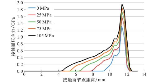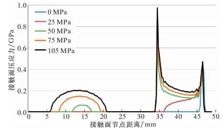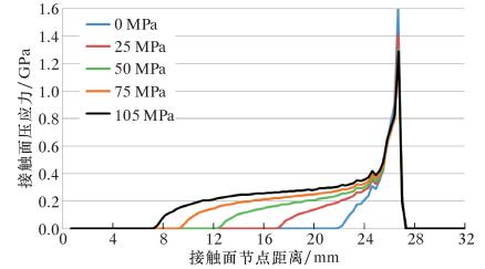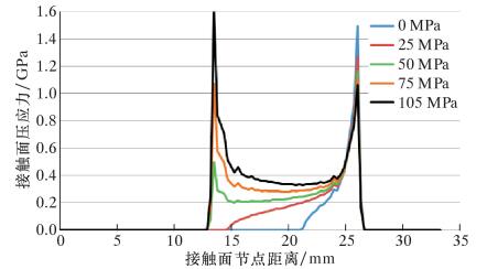 | 图 13 不同内压下Ⅱ型主密封面压应力分布曲线 Fig.13 The compressive stress distribution curve of the main sealing profile of theⅡ-type seal under different internal pressures |