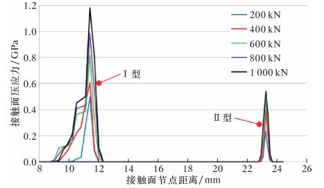 由图 9及图 10可以看出,对VGX密封圈施加一定预紧力后,无论是Ⅰ型还是Ⅱ型型面,接触面均会产生一定压应力,形成锥面环形密封带,且随着预紧力增大,密封带宽度与最大压应力亦不断提高,密封性能显著增强。但当预紧力达到一定值后,密封带宽度与最大压应力趋于稳定,不再随着预紧力的增大而提高。对于该预紧力临界值,Ⅰ型型面约为1 500 kN,Ⅱ型型面约为1 250 kN,两者相差不大。结合图 11可以看出,2型面产生的密封带均位于VGX密封圈下部区域,因此Ⅱ型型面上部空缺区域(备用密封面)并不影响主密封的初始密封能力。