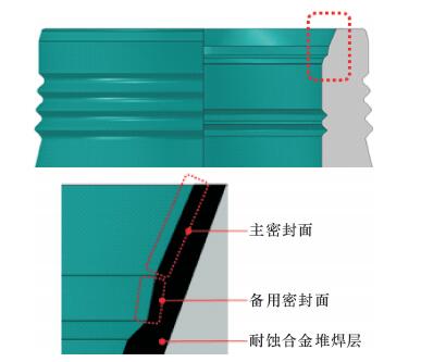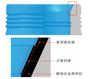 2.2.1 Ⅰ型密封型面Ⅰ型密封型面(见图 2)除主密封面外,还设有备用密封面,满足应急操作要求;同时,密封型面区域设计了耐蚀合金堆焊,以延长腐蚀作业环境下的使用寿命,满足水下装备对安全可靠性的要求。