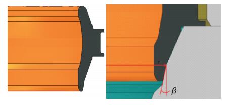 Ⅰ型密封型面备用密封面钢圈如图 4所示。与VGX钢圈相比,该钢圈下端延伸较长,延伸外表面为密封面,工作状态下,其与备用密封面紧密接触,形成牢固可靠的锥形环状密封带。其关键设计要素有半径r和倾角β。