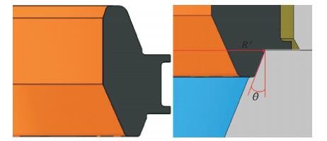 与Ⅰ型密封型面备用密封钢圈相比,Ⅱ型密封型面备用密封面(见图 7)钢圈下端明显缩短,下部外表面为密封面,工作状态下,备用密封面与其紧密接触,形成牢固可靠的锥形环状密封带。其关键设计要素有半径R′和倾角θ。