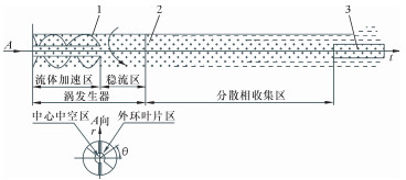 图 1 轴向涡流分离器原理示意图 Fig.1 Schematic diagram of axial vortex separator 1—螺旋叶片;2—静止分离机筒;3—轻相收集管。 |
