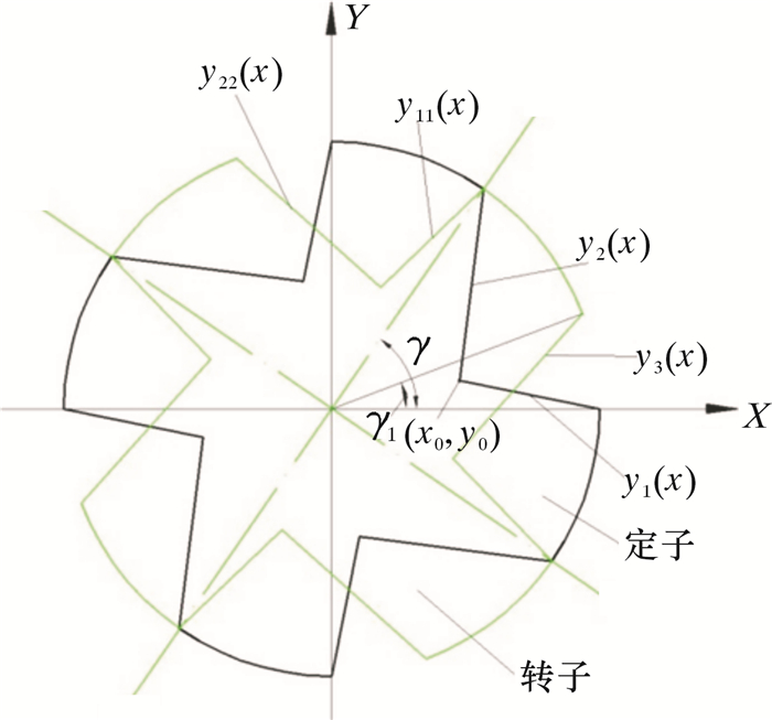 转子2直线边一般方程y11(x)、y22(x)可视作由定子2直线边方程逆时针旋转γ-α所得,转子另一条边直线方程y3(x)由y2(x)顺时针旋转π/2-γ+α所得,令β=γ-α,由此可得: