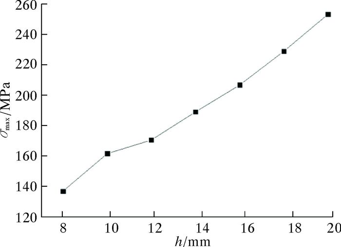 | 图 7 最大等效应力随内过渡圆弧半径变化的曲线 Fig.7 The effect of the radius of the inner transition arc on the maximum equivalent stress (h=18 mm) |