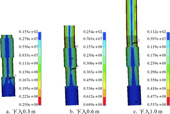 由图 5可见,随下入距离的增加,侧向位移(x方向)逐渐增加。下入任意距离时,由上至下的侧向位移逐渐增大,说明下入过程中,螺杆钻具在井眼限制下不断在弯曲,由此而产生弯曲应力。从图 6也可以看出,应力主要由弯曲产生。